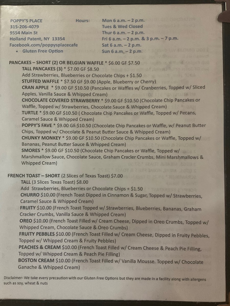 Welcome to Poppy's Place, a delightful cafe nestled at 9554 Main St, Holland Patent, NY. Known for its warm, family-oriented ambiance and exceptional service, Poppy's Place is a haven for food lovers craving wholesome comfort food.